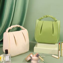 This portable zippered cosmetic bag is made of polyester material, with a stylish and eye-catching pleated appearance, making it the best choice for you to showcase yourself. Various colors are available to choose from. The interior of the bag is a mesh storage bag, which can store almost all of your cosmetics by pulling up the hook. It is very practical and convenient to carry, making it a necessity for you to travel and go out.